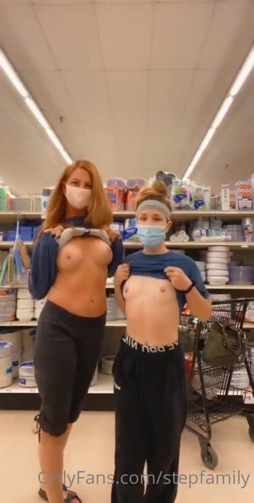 Mother and daughter flashing their tits on the public! A risky bet pushes a mother and daughter to flash their tits in a busy hypermarket. Watch their naughty public dare unfold in this steamy incest roleplay video.